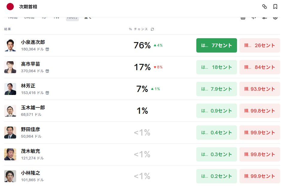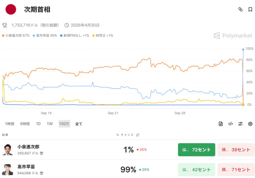 ↓アメリカの賭けサイト・ポリマーケットでは10月1日(水)段階で小泉勝利確率は76%、投票日の10月4日(土)時点では80%を越えていました。
