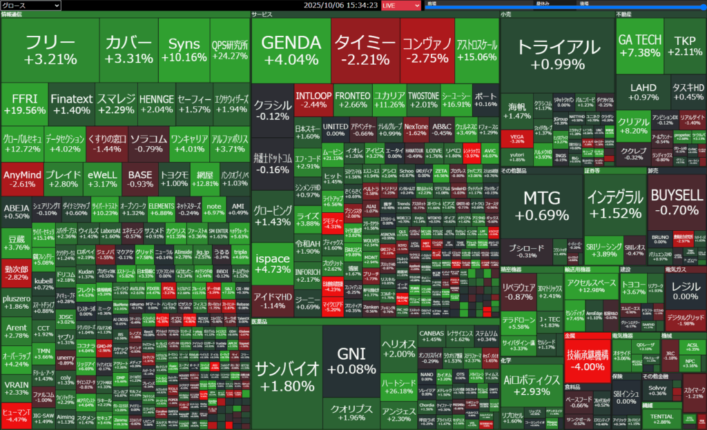 総裁選マネゲ銘柄は宇宙関連が当初寄り天も後場から奮起しグロース指数を押し上げた一方、高市が頻繁に言及していたペロブスカイト関連や量子コンピュータ関連は弱かったです。