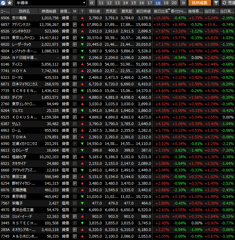 基本的にGUし過ぎて多くの銘柄が寄り天の中、半導体のアドバンテストと東京エレクトロンが寄り底で日経を押し上げました。
