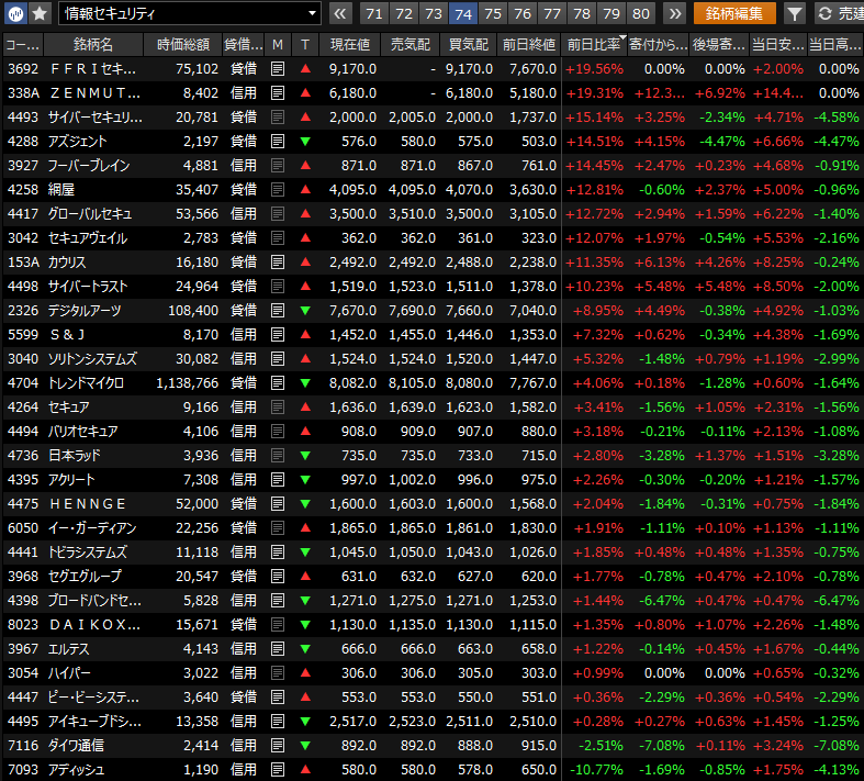 情報セキュリティはマネゲ感度の高いFFRIやZENMUがストップ高で、その他小型が続きました。