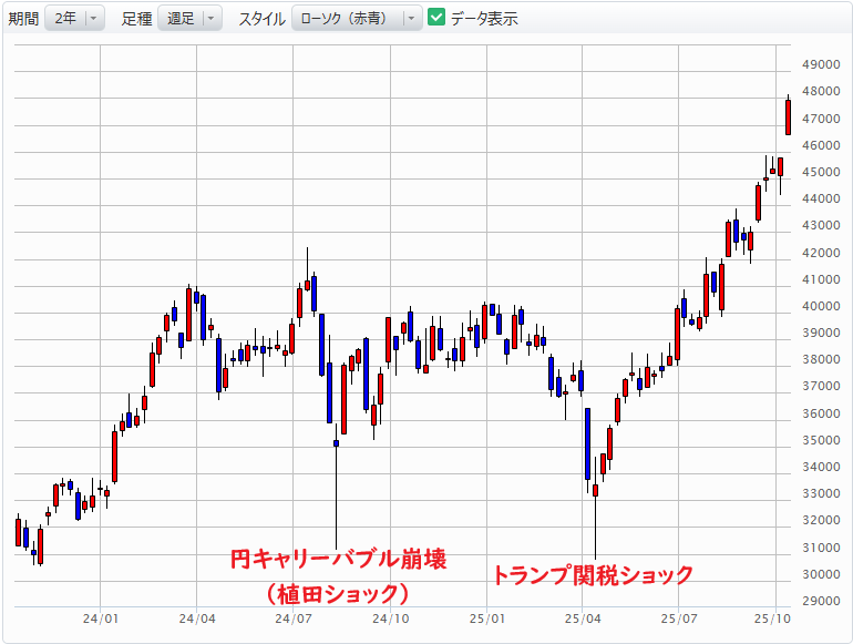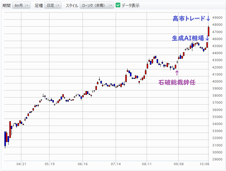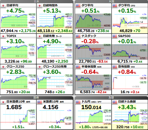 結果、前営業日に日経平均史上最高値近辺だったにも関わらず、年内利上げなし+積極財政=円安進行で一時48000円を超えて5%近く上げ、終日強く引けました。