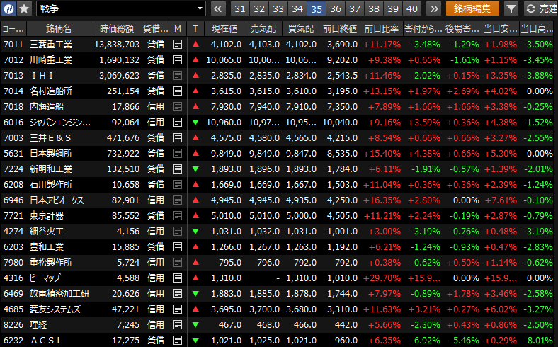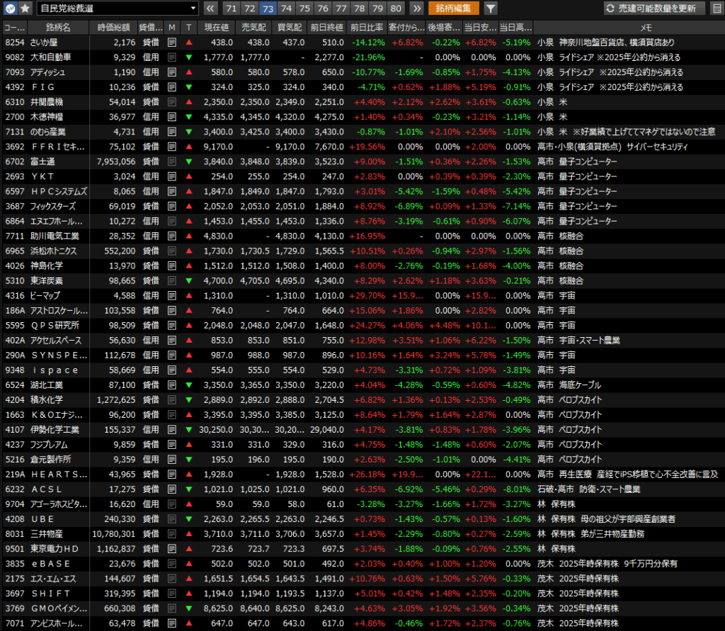 大証の日経先物はサーキットブレーカーで始まり48060円で寄った後、東証開場直後まで寄り天になりますが、東証では多くの銘柄がGU寄り天に沈む一方、高市銘柄だけが上がり相場を牽引しました。