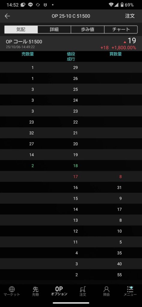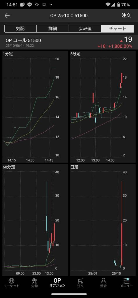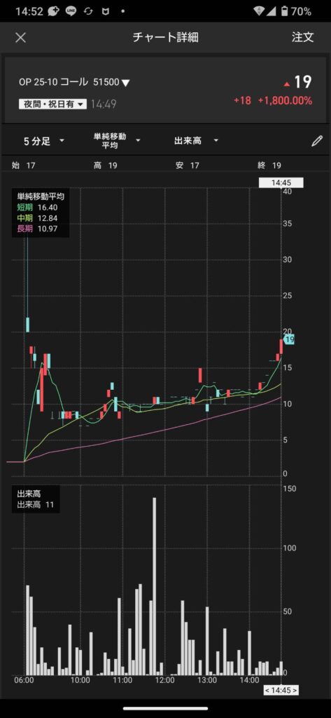 暴騰・暴落ではオプションが話題になりますが、今回はオプションSQ周という事もあり、屑コールが朝一のパニック時に一時3400%(1円→34円=34倍)を付けた後も+1800%(18倍)と高値で推移でした。