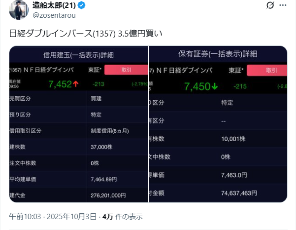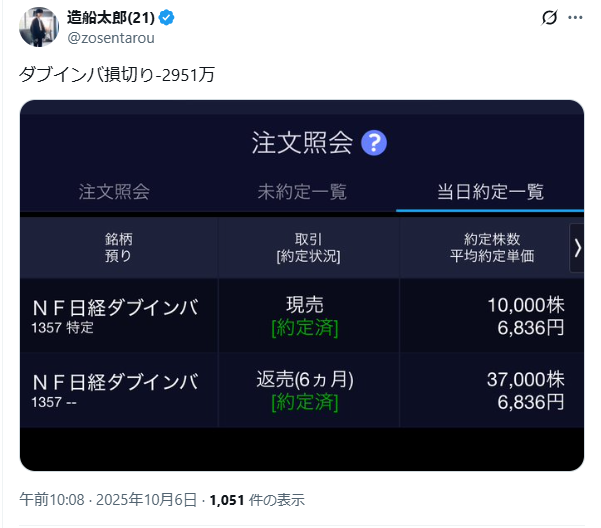 日経暴騰時にはダブルインバースで損切が話題になりますが、今回は何かと市場を賑わせている造船太郎氏が餌食となりました。