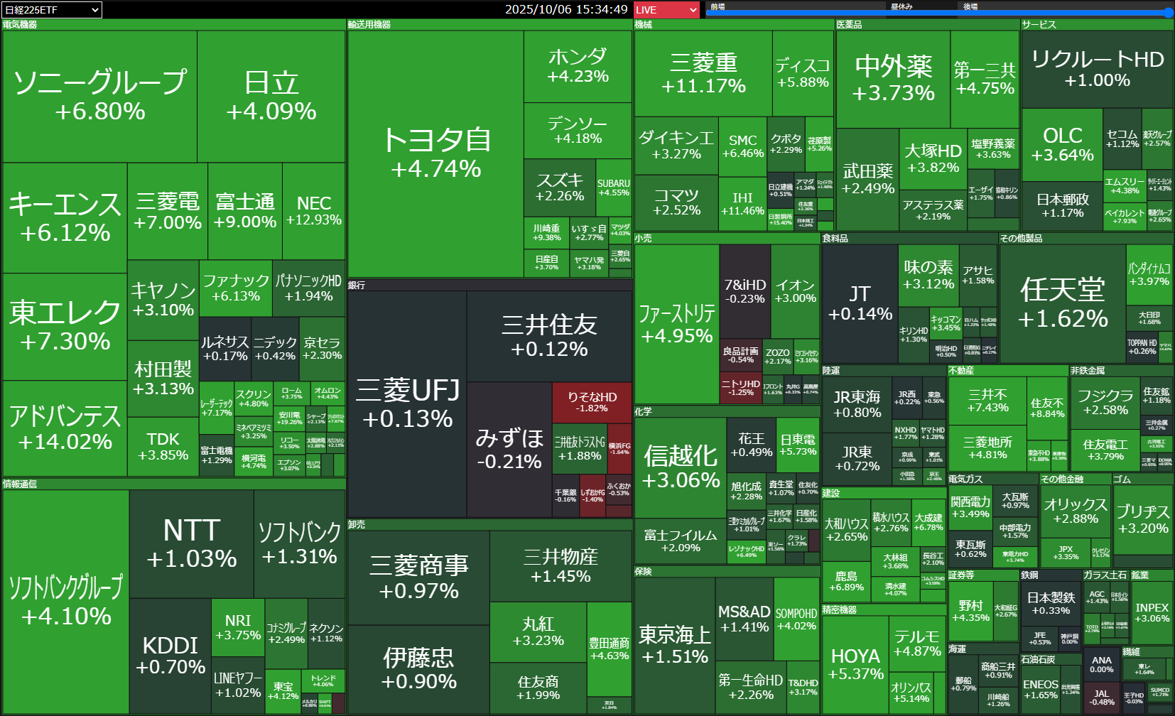 2025年10月6日(月)、まず一番早く開く日経CFDでパニック買いが起こり、東証開場前に一時48512円をつけました。