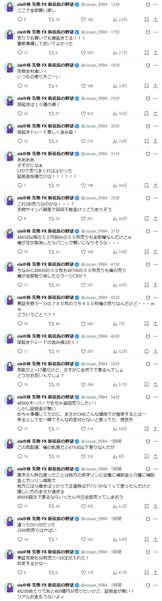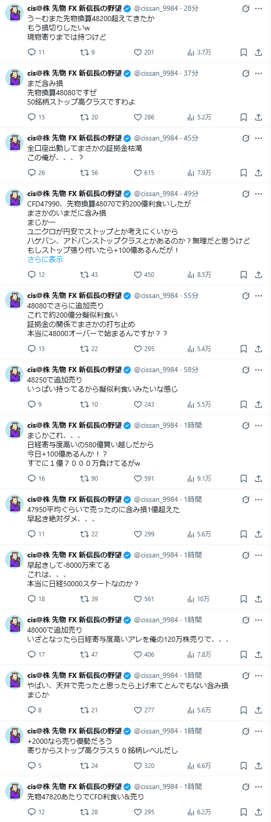 相場が荒れる時に常に稼ぎ続けるCIS神は金曜日に先物や半導体を全力ロングで持ち越し、先物ロングは開場前7:35頃に利確からのドテンショート(開場前8:49には10億利確)と往復で抜いた挙句、半導体はアドバンテスト1銘柄で1日で20億含み益が増えた上に、何やら後場に買い増したようです。